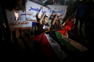 The Palestinian youth take part in rally in front of the headquarters of the Egyptian embassy in Gaza City to protest against closure Rafah crossing and destroy the tunnels and appeal Egypt government to open both of them.